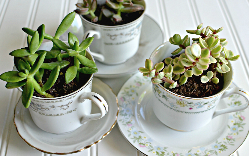Нетрудно вырастить сад в старых чашках и в графинах. Для этого необходимо аккуратно просверлить на дне дренажное отверстие и использовать блюдца, чтобы защитить поверхность опоры от воды. В такие емкости лучше высаживать анютины глазки или любые другие низкорослые цветы. Подобные композиции – прекрасное украшение для кухонь или для гостиных. Выглядят они всегда свежо и интересно.