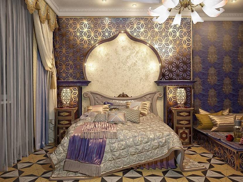 Этот вариант имеет два решения. Либо подбирается декор, передающий настроения арабских сказок, либо останавливаются на японских или китайских мотивах. В первом случае при оформлении необходимо максимально сгладить яркость красок. Иначе будет трудно полноценно расслабиться.