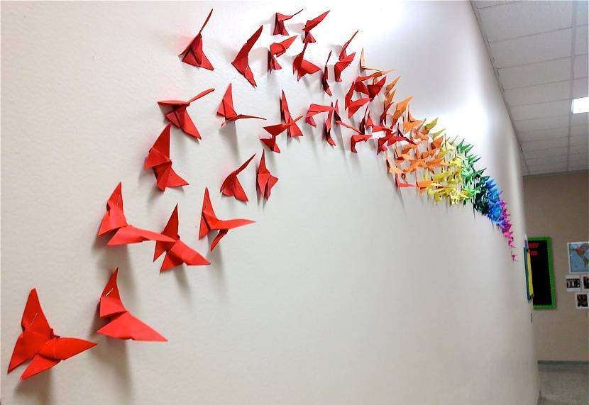 Для ее создания необходимо прикупить белый холст и упаковочную бумагу, лицевая сторона которой окрашена под «омбре» (градиент цветов). При помощи трафарета из нее вырезается три десятка бабочек разного размера. После остается лишь собрать их в стайку на холсте, которая разлетается во все стороны, закрепить каждую бабочку клеем. Такое панно можно вешать где угодно (над обеденным столом, над диваном в гостиной, в прихожей на стене). Она неизменно будет вызывать улыбку, и радовать своей простотой.