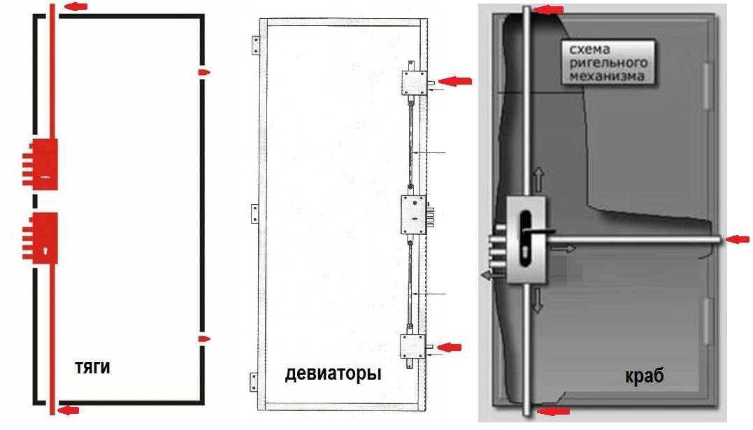Некоторые двери снабжены дополнительными устройствами для защиты от механического взлома. Это штыри и ригеля, которые при повороте замка выдвигаются из полотна двери, входя в сделанные под них отверстия в дверной коробке. Есть несколько видов этих устройств: тяги, девиаторы и крабы.