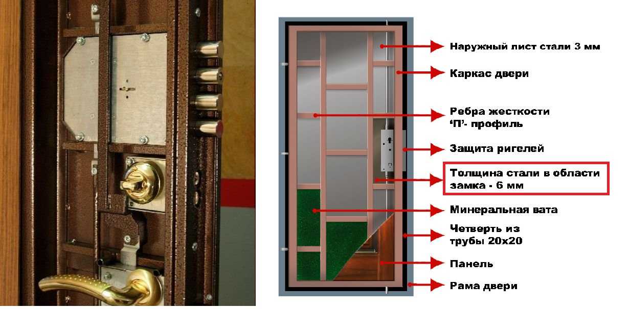 Конструкция двери располагается между двумя стальными листами, причем толщина каждого — минимум 2 мм. Есть также новейшие модели с наружным листом толщиной 3 мм.