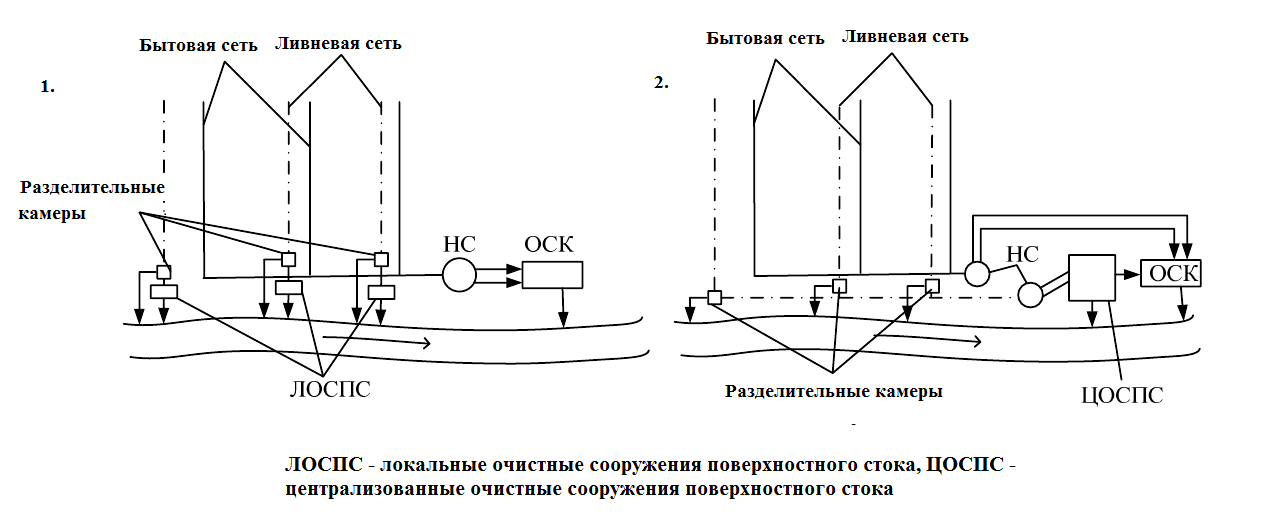 Системы первого вида представляют собой сеть отдельных подземных труб для бытовых, промышленных и ливневых стоков, которые, не смешиваясь транспортируются к местам сброса.