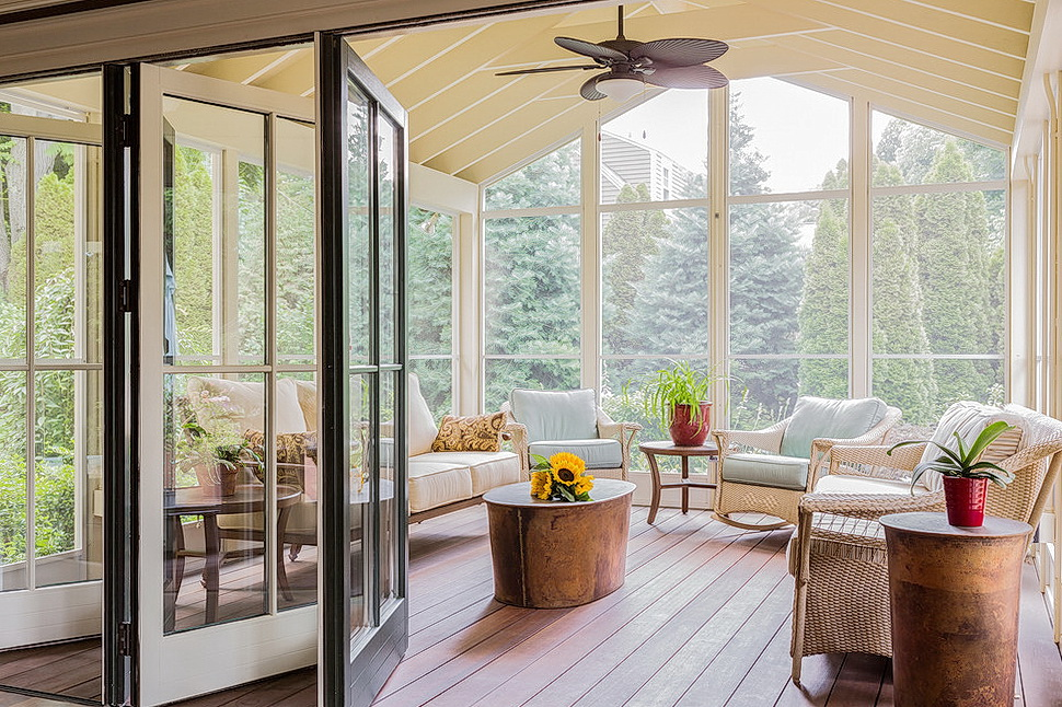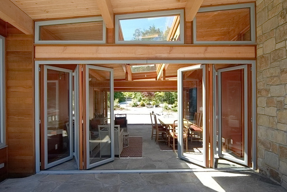 При изготовлении межкомнатной «гармошки» без , конструкцию можно монтировать на всю высоту помещения. Механизм для дверей – гармошка устанавливается в малогабаритных квартирах и в загородных домах, где эта конструкция станет дополнительным выходом, ведущим в сад, как на фото.