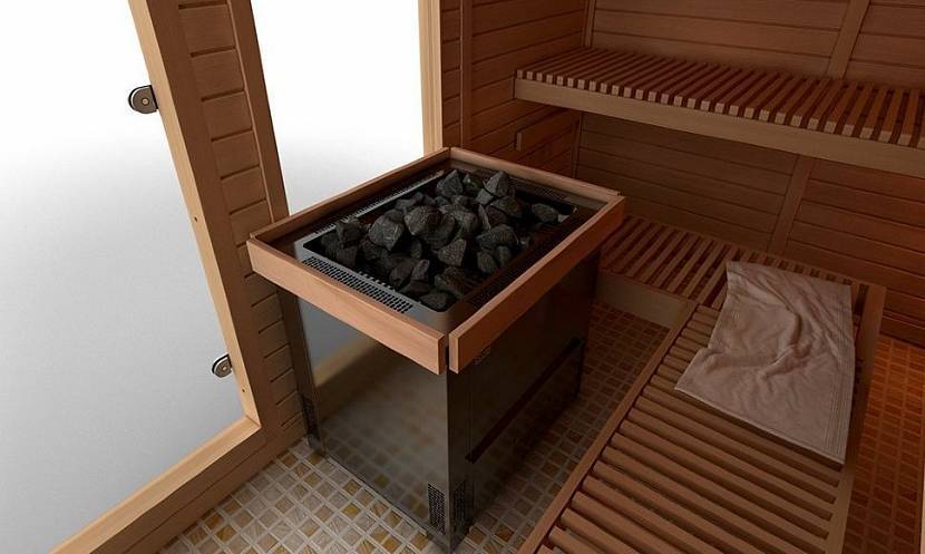Такое расположение менее затратно по материалам, но требует повышенного внимания и соблюдения правил пожарной безопасности. Встречаются конструкции открытого типа, когда камни уложены сверху печи. Поливая их водой, можно регулировать количество пара в помещении.