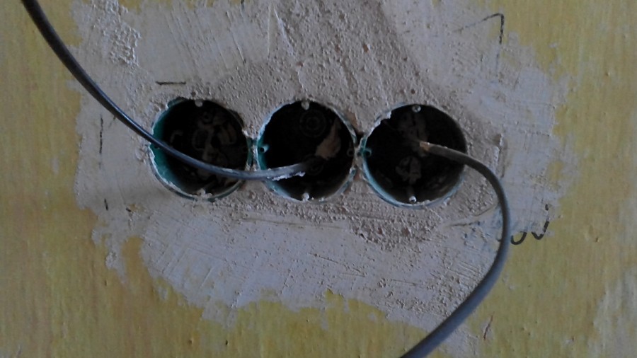 - Проламываются отверстия в подрозетнике для заводки кабелей питания.