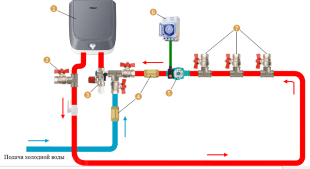 1 – бойлер; 2 – кран для забора воздуха (необходим при сливе бака); 3 – система, обеспечивающая безопасность; 4 – обратный клапан; 5 – насос для циркуляции воды; 6 – таймер (недельно-суточный); 7 – потребители горячей воды.