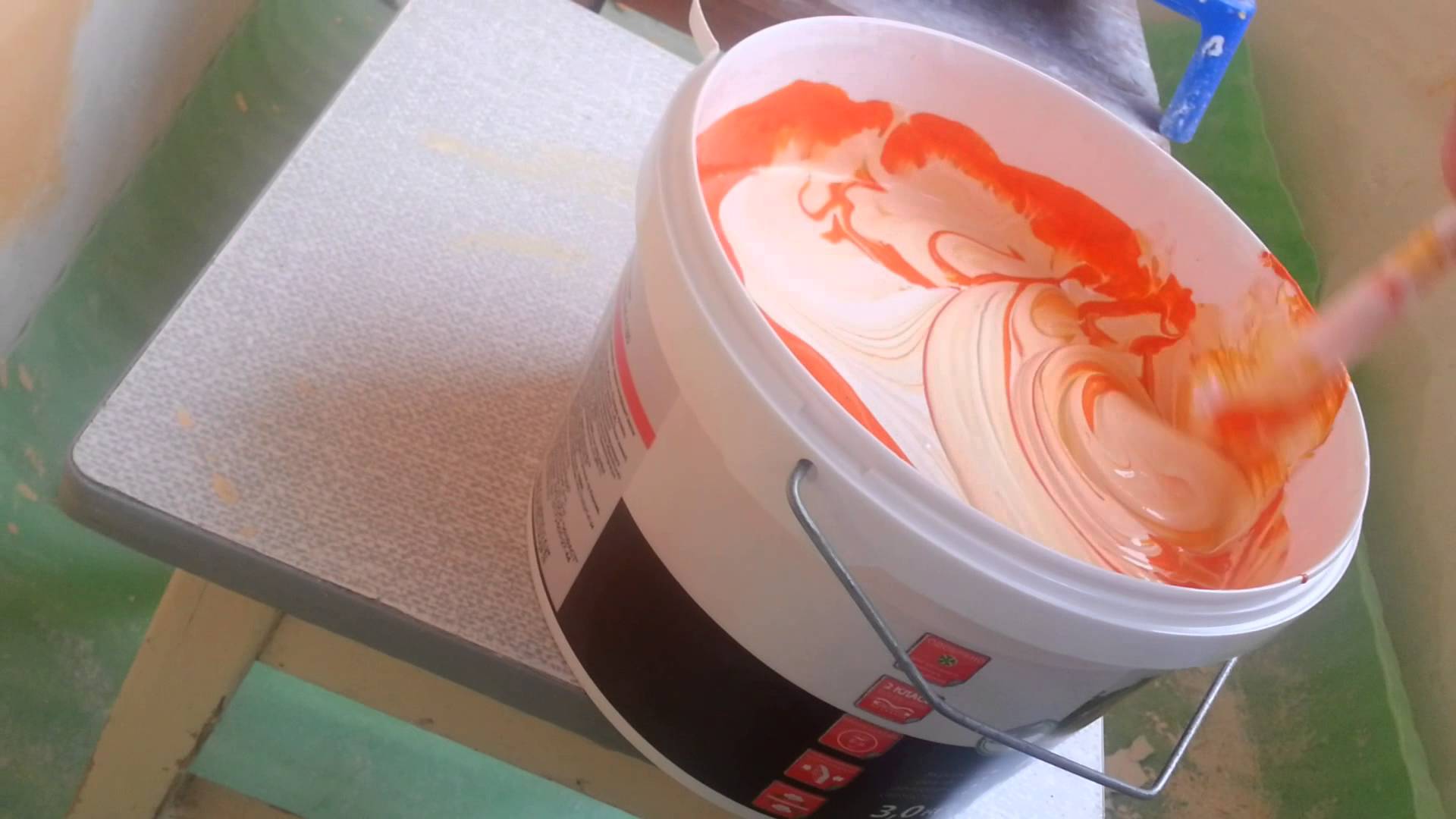 Затем колеруют предварительно подготовленным колером. Разбавлять цветом нужно сразу всю банку, чтобы получилась однородная масса. Цветной краски готовят процентов на 10 больше, чем необходимо, чтобы оставить немного такого же цвета в запасе. Иногда приходится подновлять некоторые участки, чтобы цвет не различался. Цвет делают немного темнее желаемого, потому что, после высыхания он светлеет.