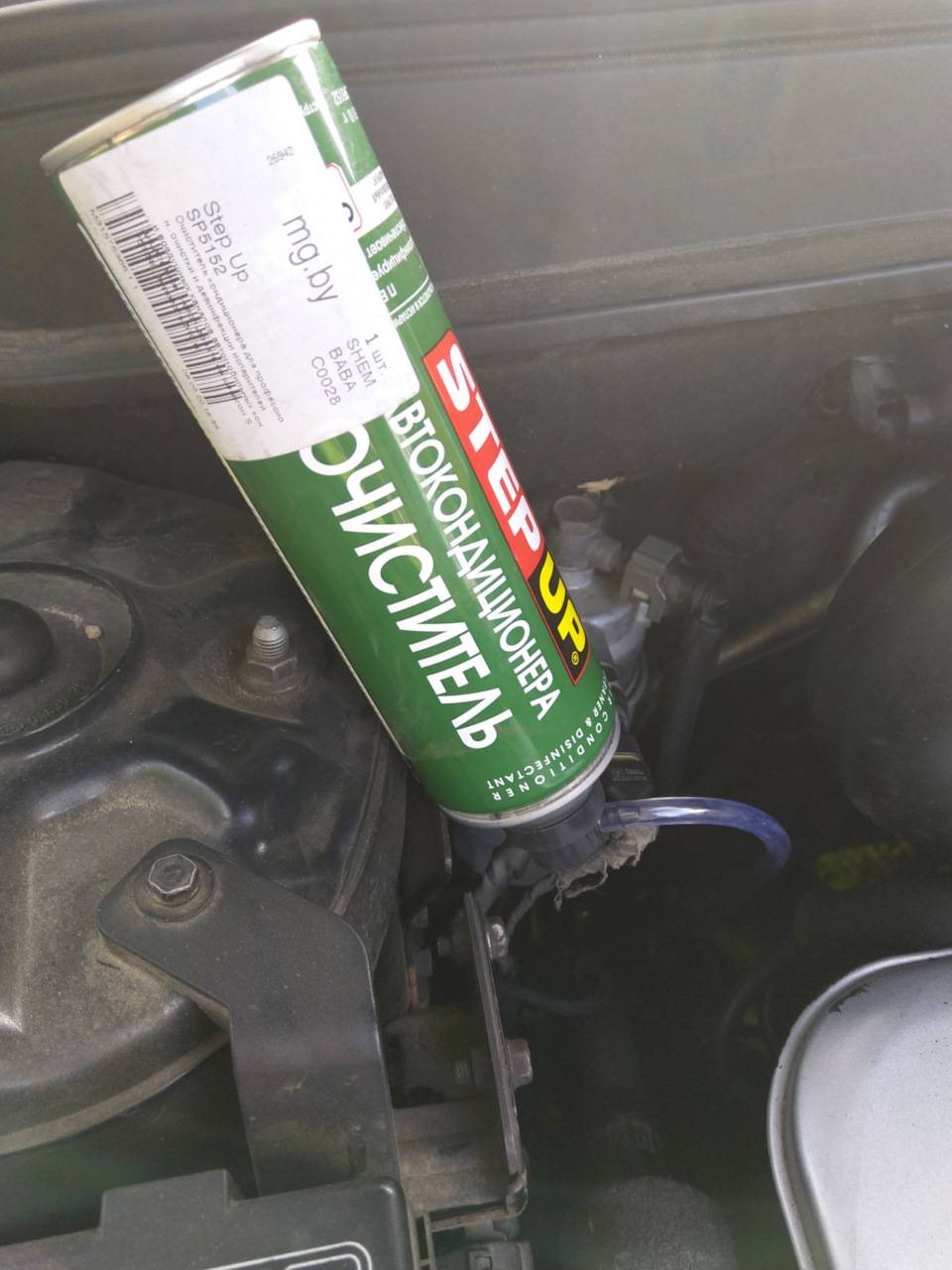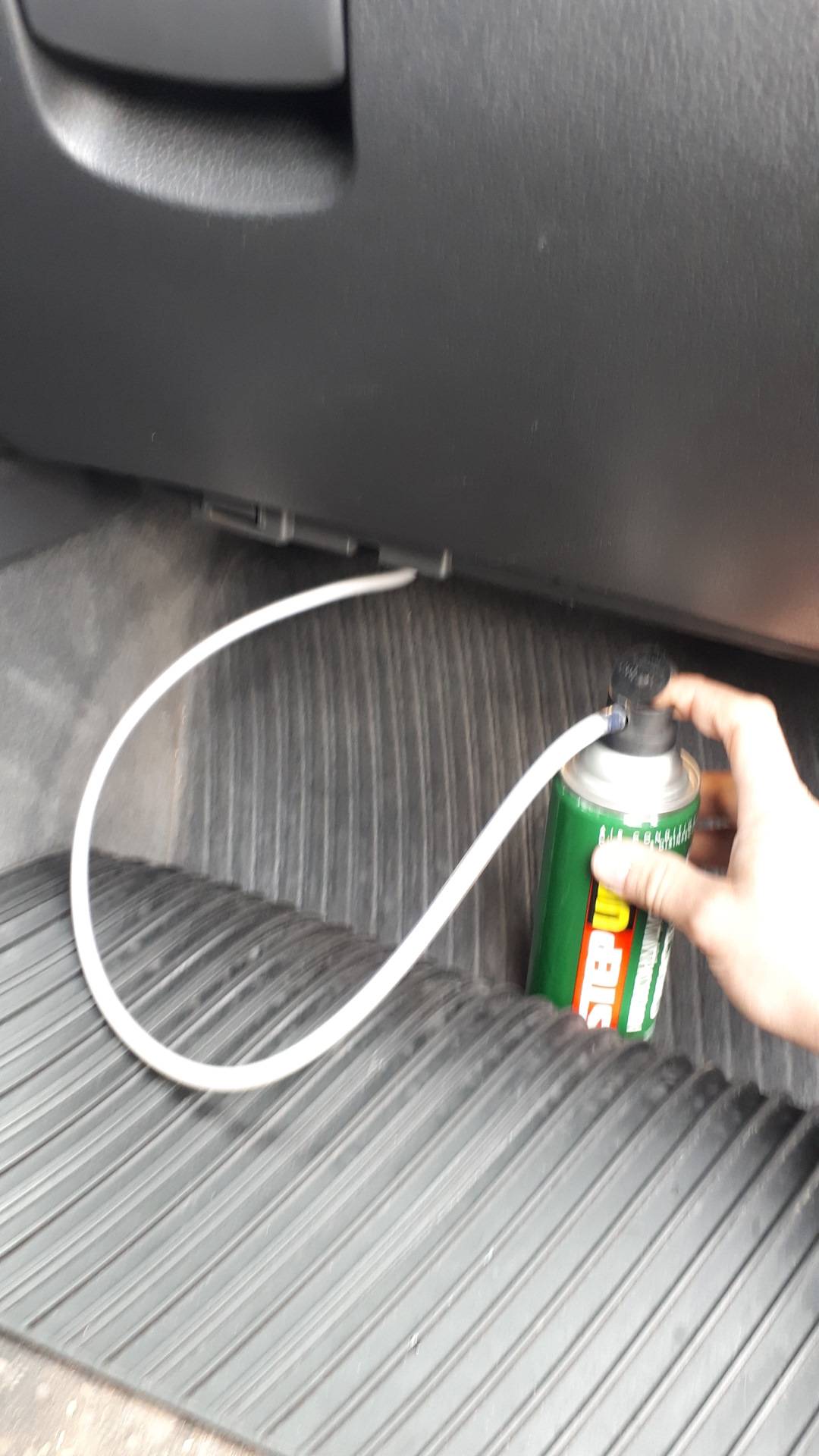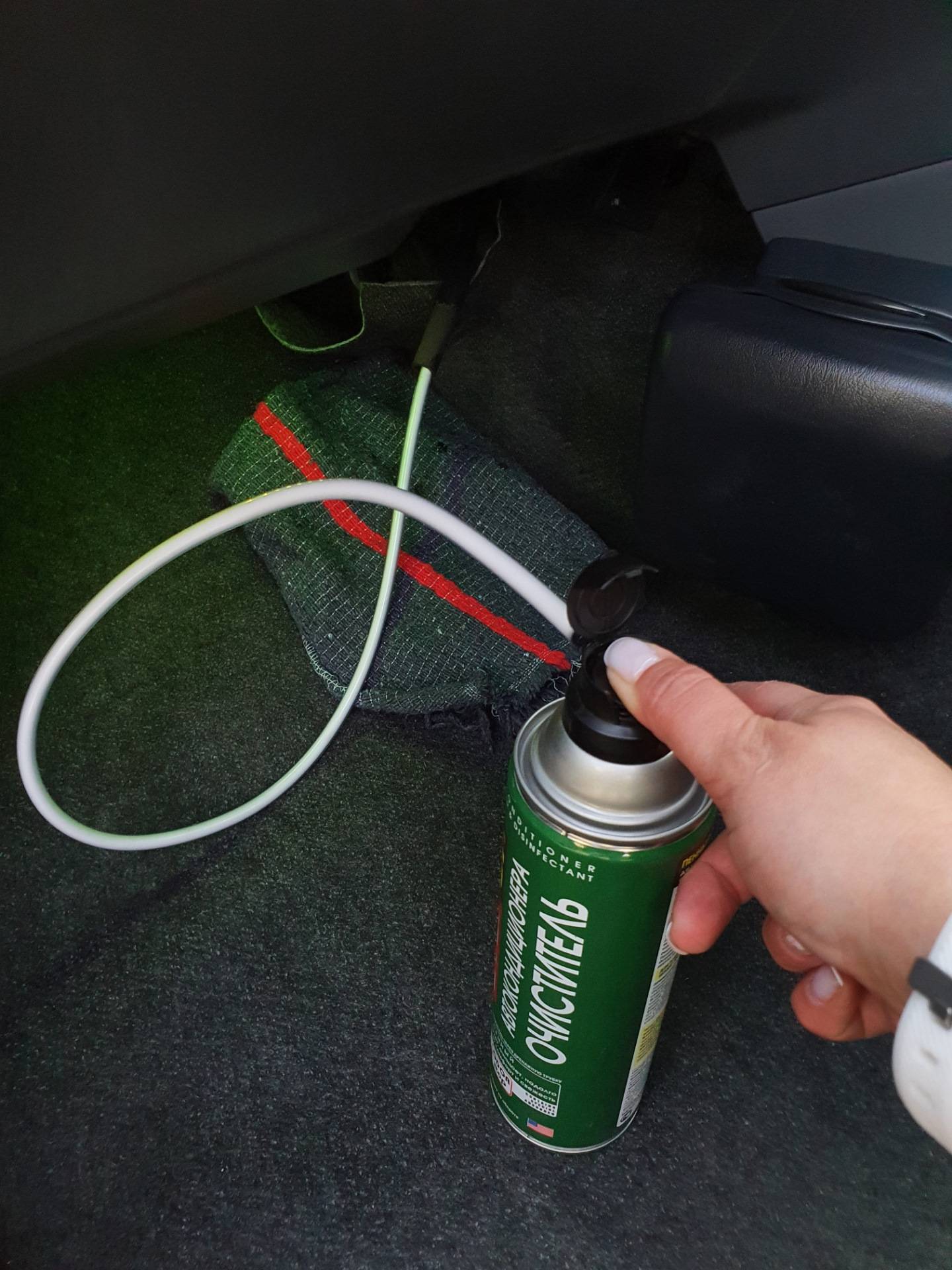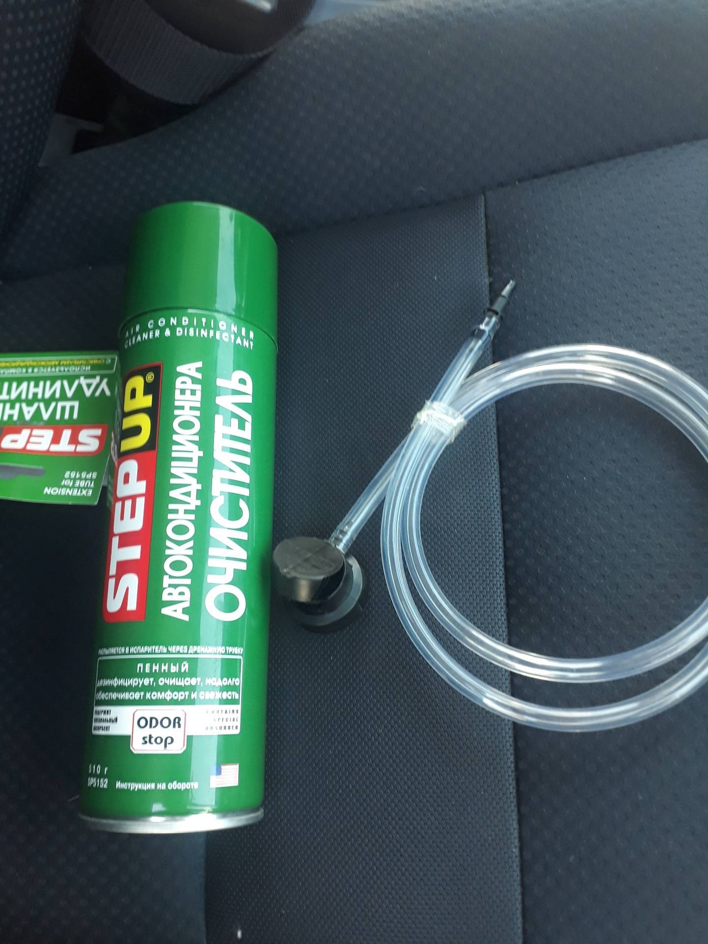 Их содержимое распыляется в отверстие забора воздуха сплит-системы и воздухоотводы при работающем на полной скорости вентиляторе. При этом все окна в машине должны быть закрытыми. Ждем 10 минут, выключаем двигатель и проветриваем салон.
