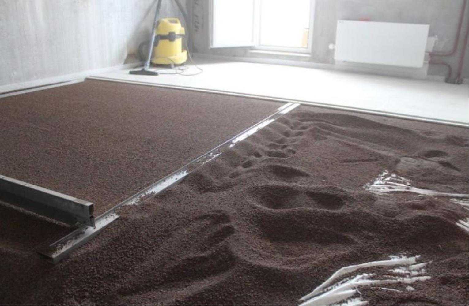 Вместо керамзитного песка можно использовать обычный строительный сухой песок. Смешивать разные материалы или разные фракции нельзя, так как рано или поздно они дадут усадку. А при укладке ГВЛ на пол требуется ровное основание без провалов. Так что просадок лучше не допускать.