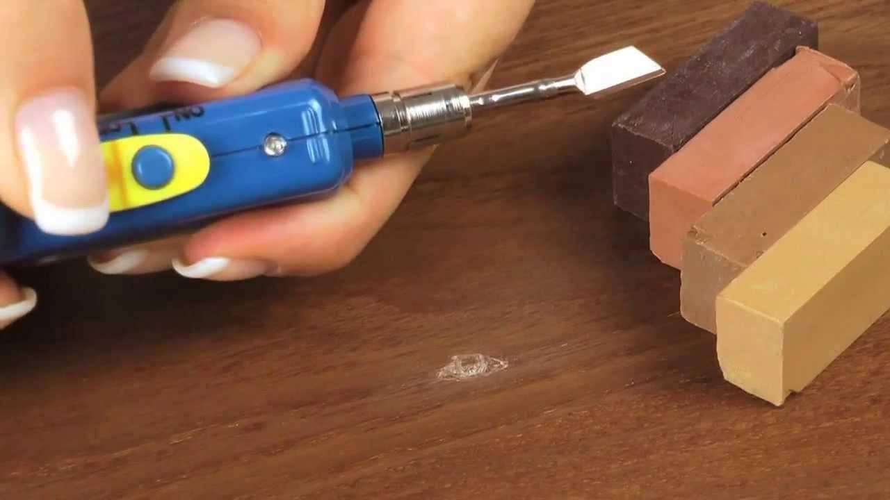 С его помощью можно замаскировать весьма внушительные изъяны, такие как сколы на углах столов или ящиков. Если не удалось найти подходящий оттенок, то следует купить два-три похожих, а затем смешать их, настрогав нужное количество. Такой воск плавится с помощью зажигалки или паяльника, а затем с избытком наносится на проблемное место. Лишнее снимается пластиковым шпателем или картой, затем шлифовка и лакировка. Если фактура не соответствует первоначальной, её можно дорисовать тонким фломастером, и только после этого залакировать.