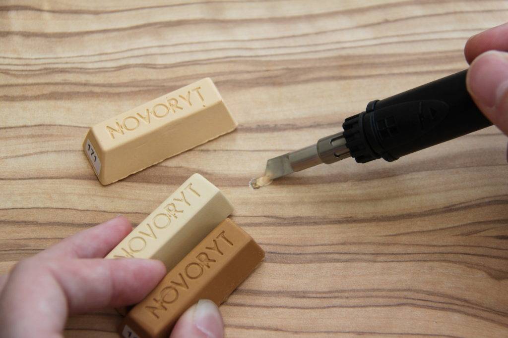 - При помощи резинового шпателя и размягчённого воска заполнить выемку и хорошо утрамбовать.