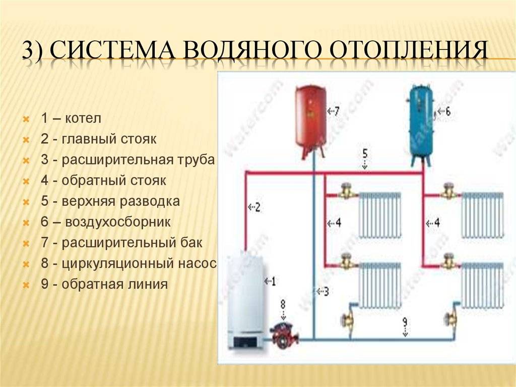 Устройство водяного отопления предполагает 3 принципиально