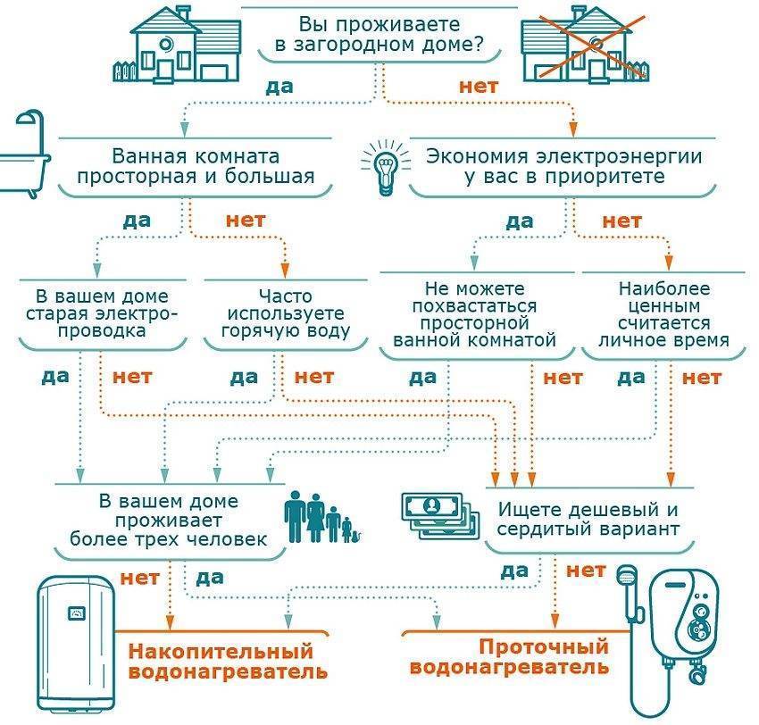 Выбирая электрический водонагреватель, прежде всего, необходимо определиться с типом прибора, который вам подойдет лучше всего – накопительный или проточный, и только потом подбирать нужную мощность и емкость.