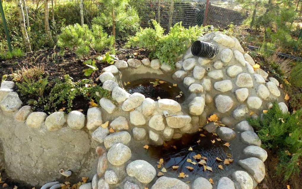 - Замаскируйте гидроизоляцию камнями, закрепите их влагостойким герметиком.