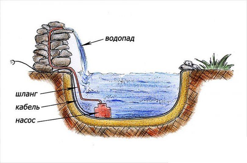 Перед тем, как проложить трубы, нужно проверить работу всего оборудования. Только после этого шланги закладываются в подготовленное место. Например, сбоку от чаши водопада с дальнейшим погружением в воду, как это показано на верхнем рисунке. Главное делать это поверх защитной гидроизоляционной пленки. Прокладывать шланги нужно так, чтобы они не бросались в глаза и не мешались под ногами.