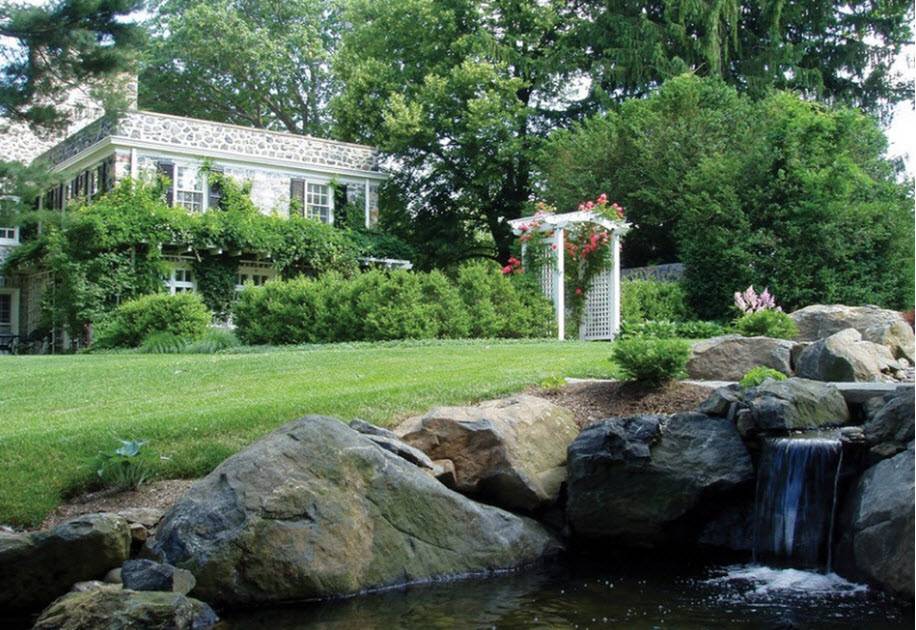 У пруда с водопадом можно обустроить уголок для отдыха – поставить садовую скамью, над которой можно расположить перголу. У воды хорошо будут расти розы, куст которых можно использовать и для декора перголы. Обычно водный уголок является любимым местом у всех членов семьи. Для детей здесь можно расположить садовые скульптуры в виде гномов, забавных зверушек.
