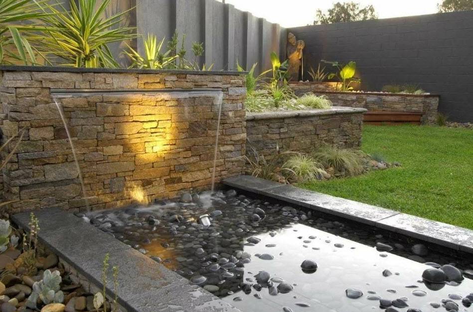 - малый декоративный водопад с неглубокой емкостью, служащий только украшением зоны отдыха. Прилежащую территорию можно украсить дизайнерскими элементами;