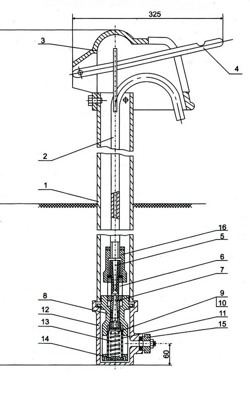 Изготовить и подсоединить к трубопроводу ручной насос (водяную колонку). Его устройство показано на чертеже. Возможно подключение электрического насоса всасывающего действия.