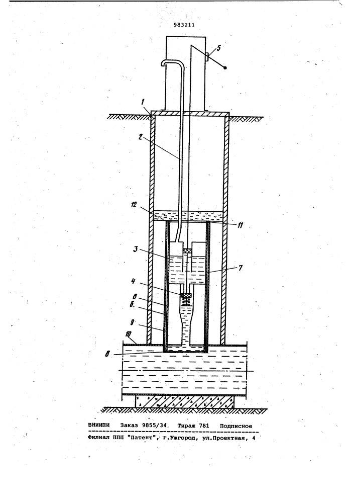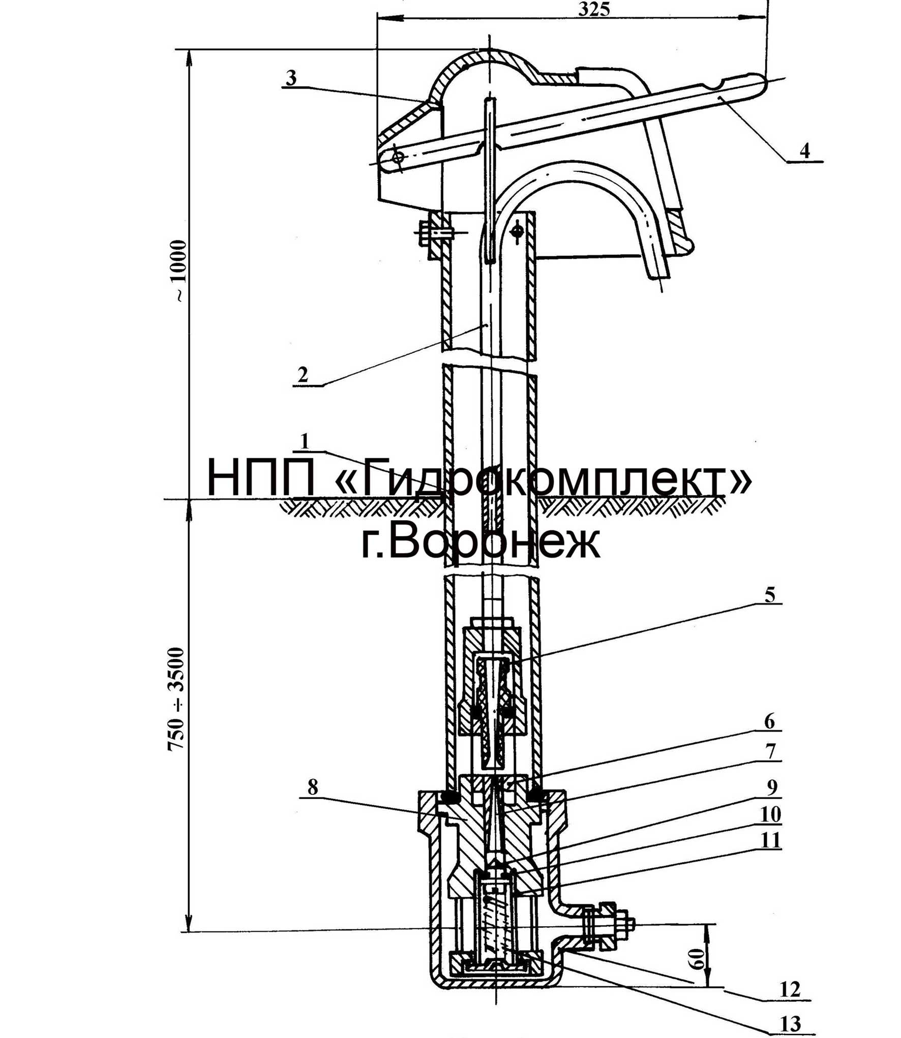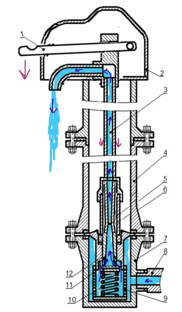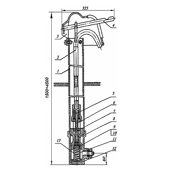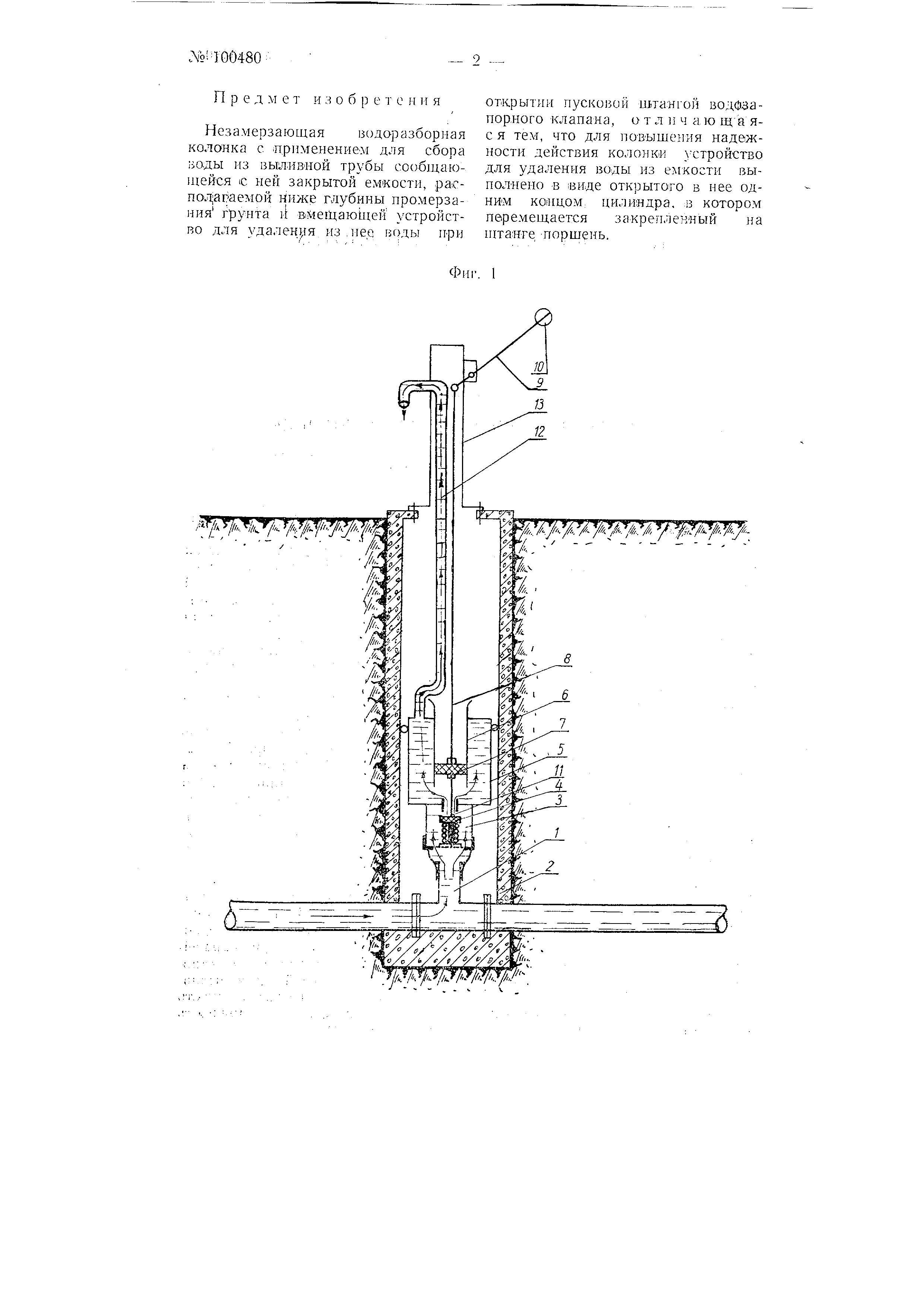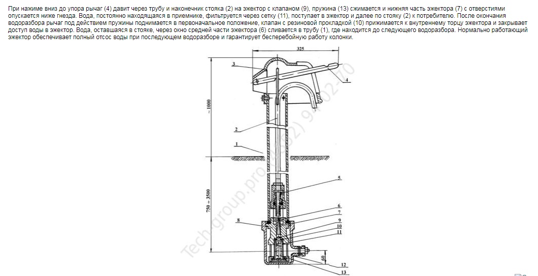При нажиме вниз до упора рычаг (4) давит через трубу и наконечник стояка (2) на эжектор с клапаном (9), пружина (13) сжимается и нижняя часть эжектора (7) с отверстиями опускается ниже гнезда. Вода, постоянно находящаяся в приемнике, фильтруется через сетку (11), поступает в эжектор и далее по стояку (2) к потребителю. После окончания водоразбора рычаг под действием пружины поднимается в первоначальное положение, клапан с резиновой прокладкой (10) прижимается к внутреннему торцу эжектора и закрывает доступ воды в эжектор. Вода, оставшаяся в стояке, через окно средней части эжектора (6) сливается в трубу (1), где находится до следующего водоразбора. Нормально работающий эжектор обеспечивает полный отсос воды при последующем водоразборе и гарантирует бесперебойную работу колонки.