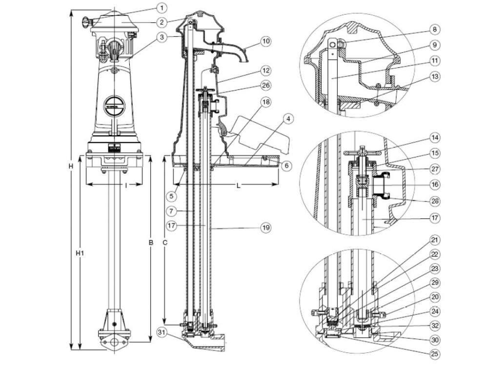 Преимущество поршневых насосов-колонок в простоте сборки и установки. Все детали, необходимые для изготовления корпуса и динамических частей, можно найти в хозяйстве или докупить.