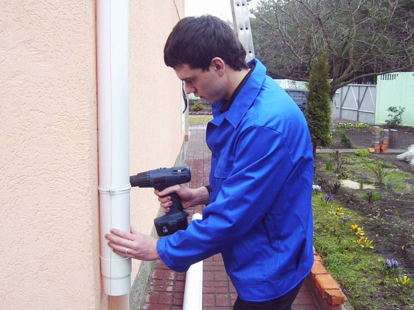 - Установка водостоков происходит в ранее обозначенных местах. Для крепления труб к стенам используют хомуты, которые фиксируют дюбелями. Расстояние между хомутами не должно превышать двух метров. Труба должна находиться на расстоянии минимум 40 мм от стены. Обрезку труб необходимо сделать при помощи ножовки.