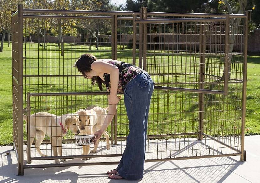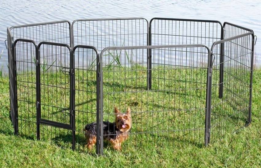 В зависимости от размеров и активности животного подбирается вольер. Для маленьких пород (Йоркширские терьеры, Чихуахуа) подойдут и брезентовые палатки, а вот для щенков или взрослых Лабрадоров, Лаек, Спаниелей нужен крепкий каркас из пластиковых труб или металлических сеток.
