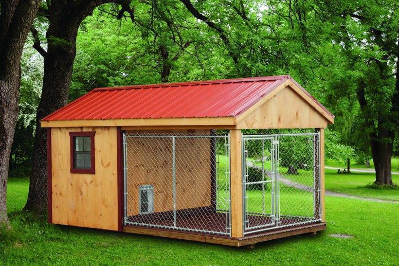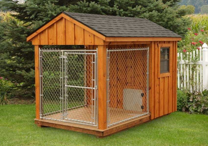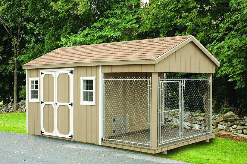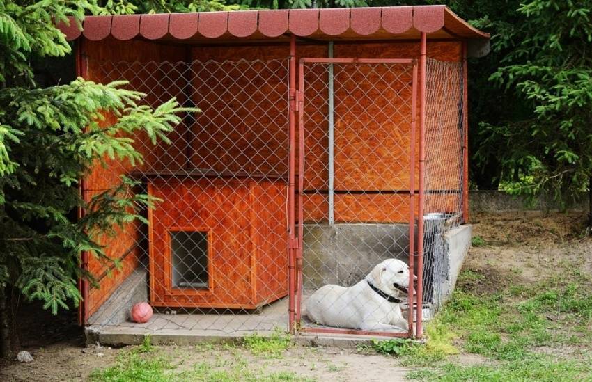 Часто уличное жилье строят для сторожевых псов, в замену цепному содержанию. Некоторые породы запрещено содержать на привязи, поэтому просторный вольер закрытого или капитального типа станет хорошей альтернативой