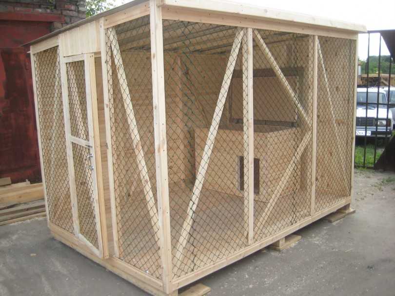 Оптимальным вариантом для домашнего питомца считается строение из дерева и сварной сетки или рабицы. Представители крупных сильных пород деревянный каркас быстро поломают. Настил следует делать из доски или прессованных плит из стружки и опилок.