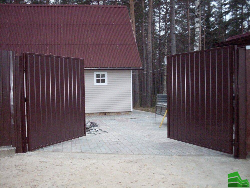 Ворота из профлиста, выполненные своими руками, можно установить на даче, на промышленной территории и на приусадебном участке. Это достаточно экономичная и долговечная разновидность ограждения. К тому же, широкая гамма выпускаемых расцветок позволяет выбрать наиболее подходящий вариант для любого участка.