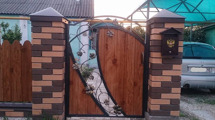 Нередко можно увидеть забор и столбы из кирпича. А вот ворота с калиткой не поддаются этому материалу. Камень обычно украшает заборные стойки или сам является основным их элементом.