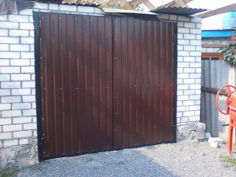 Ширина профлиста обычно составляет 110 см. Порядка 10 см уйдет на перекрытия. Таким образом, для обшивки створки двухметровой ширины нужно ровно 2 листа материала. При желании ворота можно обшить с обеих сторон.