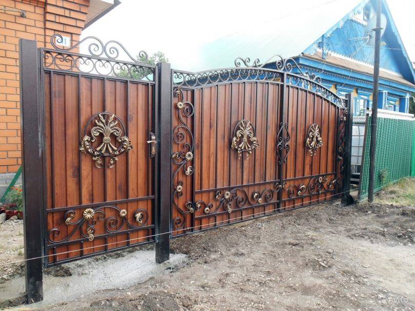 В настоящее время широко распространена практика нанесения декоративных принтов на полимерное покрытие. Ассортимент цветовых решений и рисунков огромен. Декорированные профлисты создают существенную конкуренцию всем прочим материалам при обустройстве ограждений. Умелые дизайнерские решения позволяют сделать акцент на калитке в заборе из профнастила, имитировав, например, кованые текстуры.