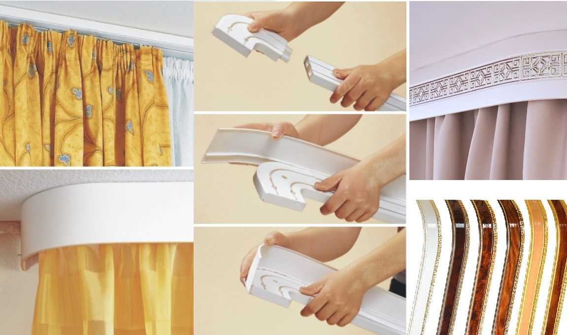 Изделия из пластика разнообразны по цвету и фактуре, небольшой вес позволяет крепить их на любую основу, над любым проемом, к потолку. Их нередко декорируют наружной планкой; благодаря несложному уходу используют на кухне. Единственный минус пластика — хрупкость, а потому неизбежное ограничение в весе ткани. Для тяжелых бархатных штор придется подыскать поддержку надежнее; в противном случае крепление провиснет, а со временем лопнет.