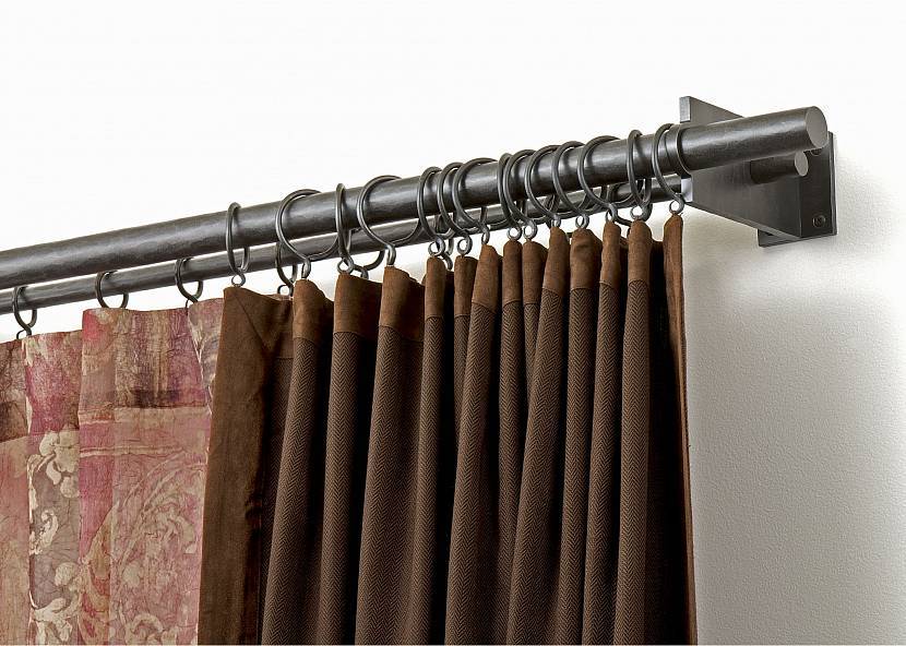 Эта конструкция представляет собой трубку, которую поддерживают два (при большой длине используют три) кронштейна. Особенностью этого вида является открытое размещение трубки, поэтому она должна привлекательно выглядеть. Существуют металлические, деревянные или пластиковые изделия штанговой конструкции. Для крепления штор на трубку нанизывают кольца с зацепами (крючками, прищепками или «крокодилами»).