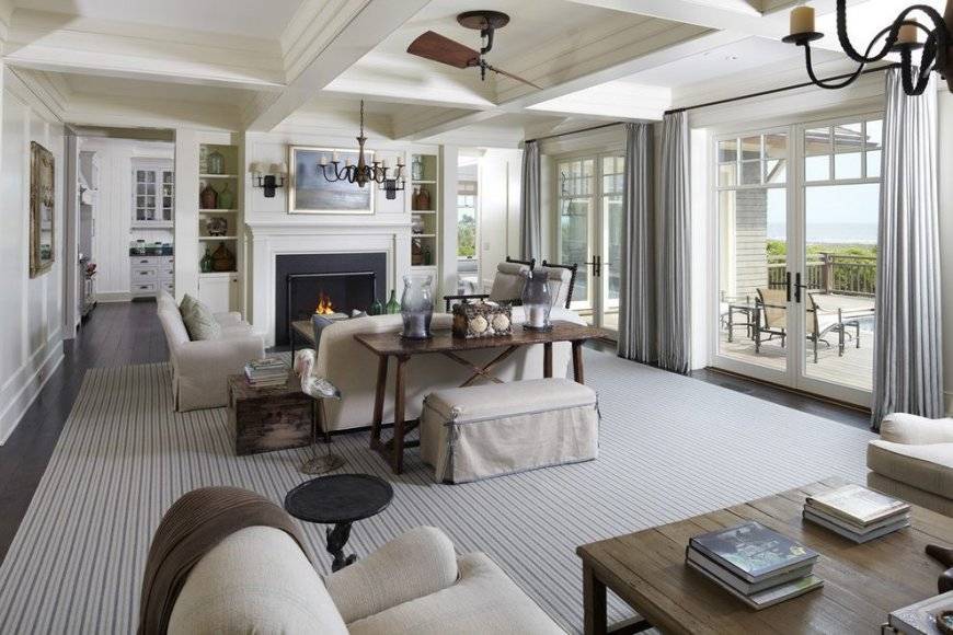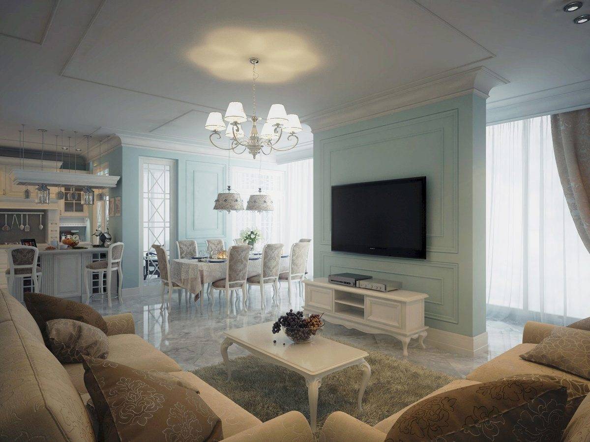 Зал в стиле прованс — это всегда светлая комната, чья палитра собрана из природных красок южного побережья Франции. Ее основу составляют натуральные светлые, пастельные и приглушенные тона, словно выгоревшие под ярким южным солнцем. Базовым чаще всего становится белый цвет, его дополняют оттенки бежевого: песочный, слоновой кости, кремовый, молочный. Возможно оформление в серых тонах.