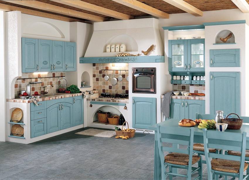 Основной упор при оформлении интерьера кухни в стиле прованс делают на натуральность, простоту, добротность. Помещение должно быть просторным, хорошо освещено. Большое количество цветов — в горшках, вазах. Кухонная утварь выставляется на открытые полочки, дополняется всевозможными статуэтками, вазочками, сушёными травами, плетёными корзиночками, баночками со специями.