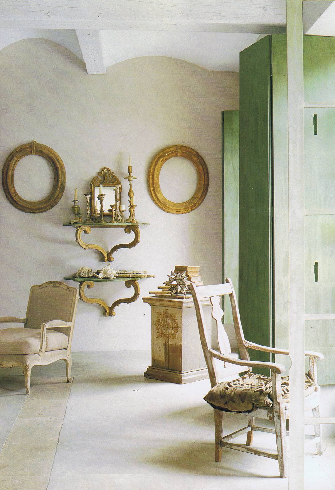 Гостиный уголок на этой фотографии олицетворяет собой подход французского кантри к мебели. Мягкие стулья с подлокотниками, стол и полки сливаются в утонченной гармонии, связаны общей цветовой гаммой нежно-белых и голубовато-серых оттенков. Данные предметы мебели обладают декоративными завитушками, что поднимает их выше строгой практичности, но подобную их элегантность ни в коей мере нельзя назвать нарочито показной или преувеличенной.