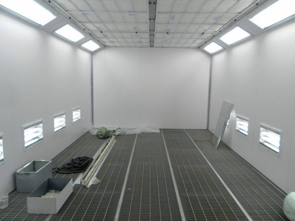 - хорошим освещением. Лампы должны быть установлены на потолке и на стенах, часть которых монтируется под углом. Желательно, чтобы внутренняя отделка не имела искривленных форм. Это поможет маляру определить качество подготовки детали к покраске и лучше контролировать перенос ЛКМ;