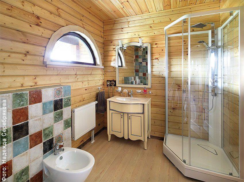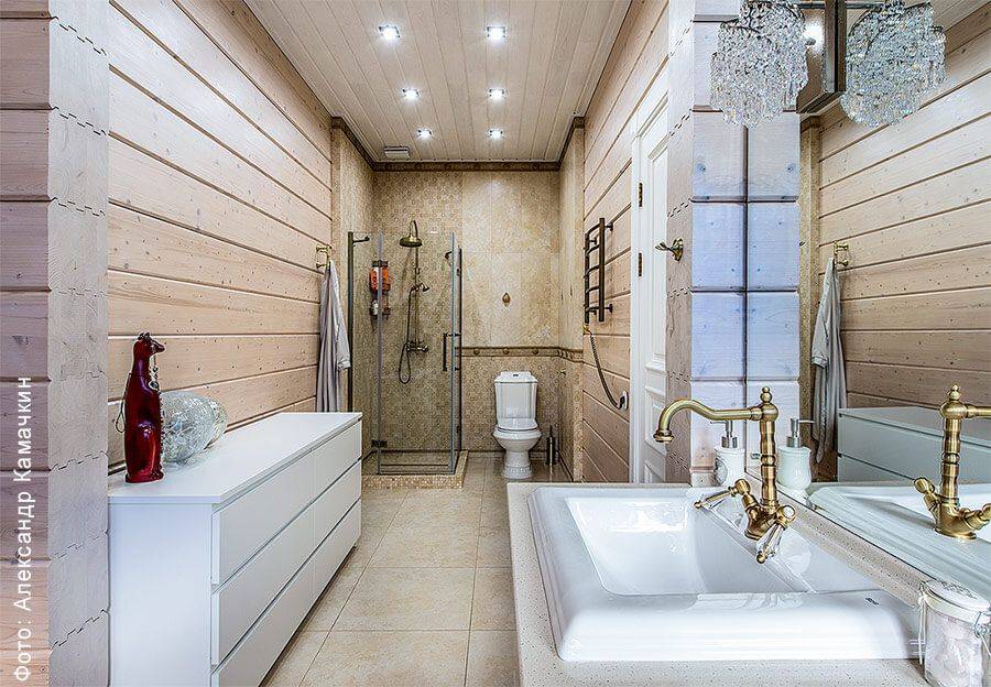 При отделке ванной комнаты в деревянном доме необходимо учитывать отличия такого жилья от квартиры. Главное отличие коттеджа — эко материалы, в частности дерево. Его не стоит закрывать влагостойкими материалами, иначе в ванной может появиться грибок.