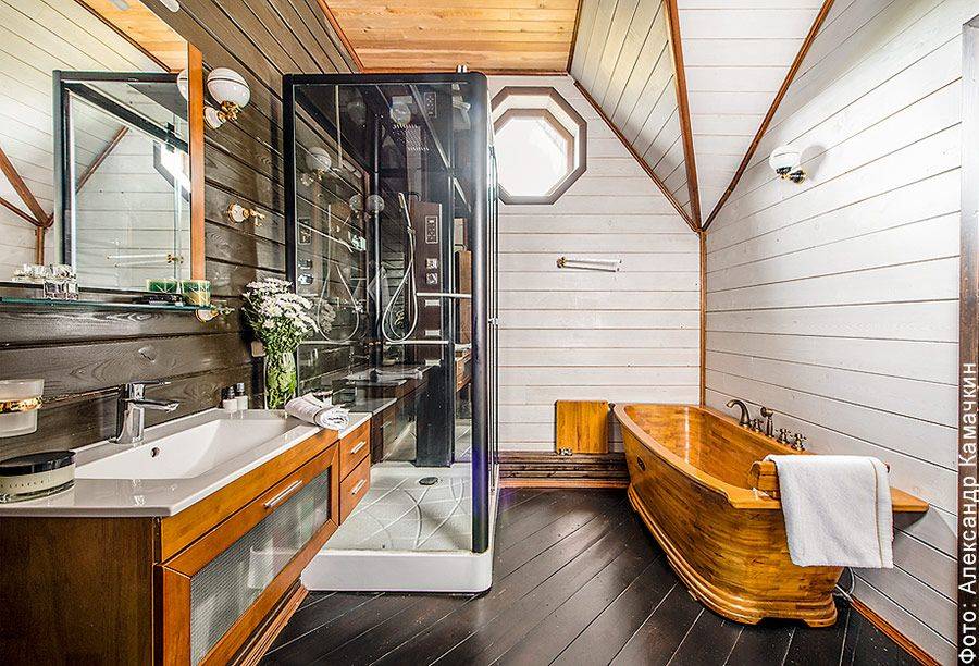 Слева: интерьер гостевого дома оформлен по проекту Анны Беляевской и Наталии Сморгонской из дизайн-студии «Арт-стиль». Справа: эффектная комбинация плитки и дерева в санузле фахверкового дома (Архбюро Романа Леонидова)
