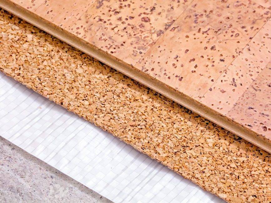 Но обязательно следует учитывать, что пробковая подложка не является влагостойкой, поэтому потребуется гидроизолировать основание.