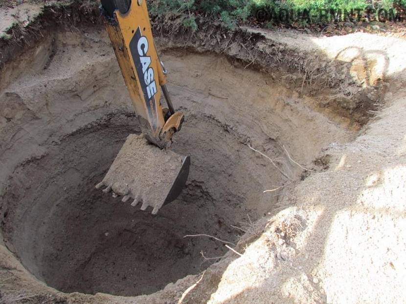 Земельные работы с применением экскаватора занимают 2-3 часа. Размер котлована должен быть несколько больше габаритов колодцев. Это необходимо для беспрепятственной установки колец и их гидроизоляции. Дно засыпают щебнем и бетонируют.