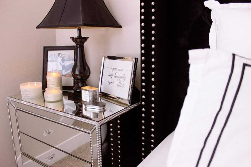 Для его расположения подбирают место недалеко от кровати, стараясь при этом отодвинуть в глубину комнаты. Это сделает тяжелый предмет менее заметным и поможет немного увеличить имеющееся пространство.