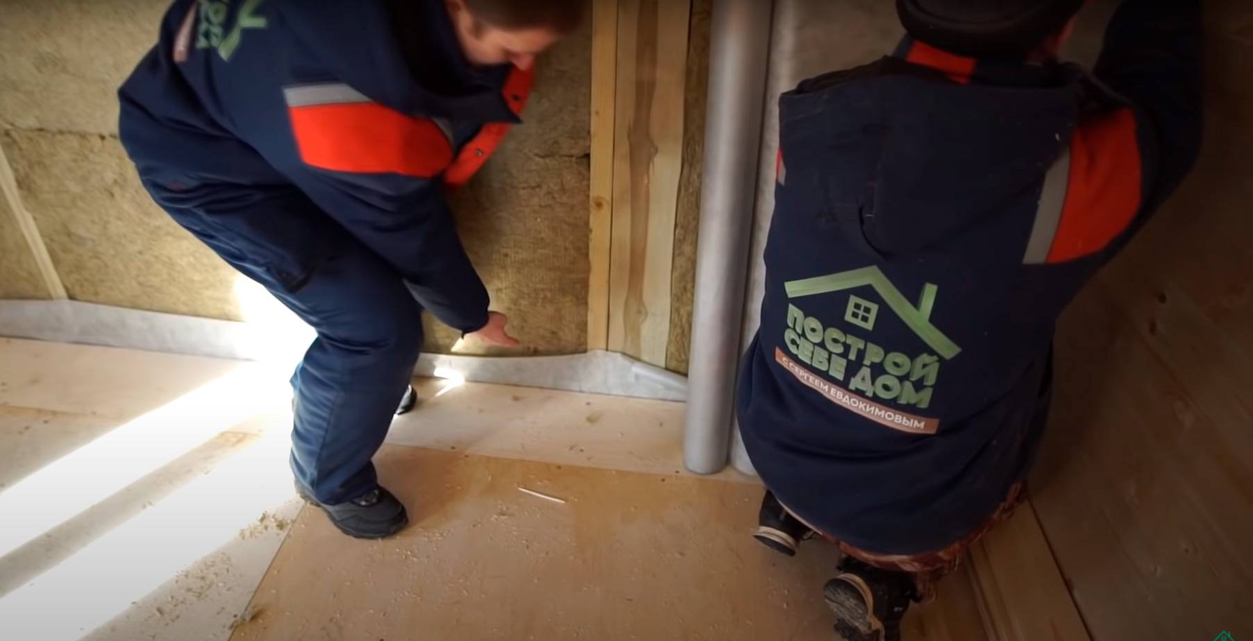 Изоспан укладывают в нахлест на ленту пароизоляции закрепленную к черновому полу, чтобы не было зазора.