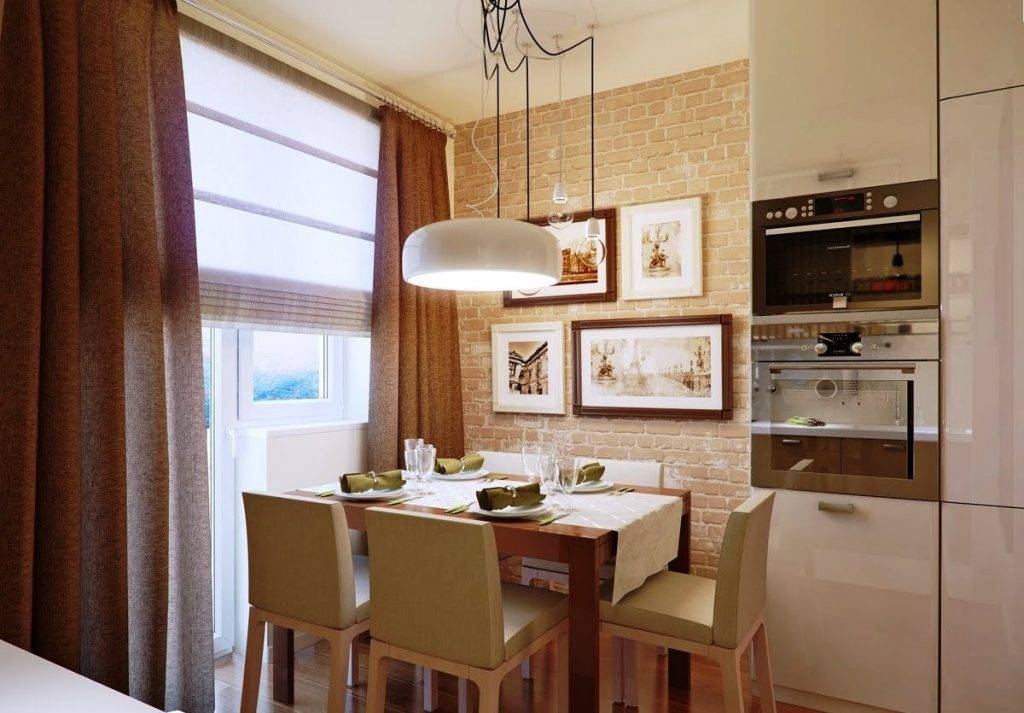 Главное – оставить проход к балкону, где, возможно, будут храниться запасы. Нужно понимать, что открытие двери будет направлять воздух от плиты прямо на занавески. Так что позаботьтесь об этом, выбрав износоустойчивый, крепкий и неподдающийся горению материал. Можно использовать жалюзи, рулонные шторы или ламбрекен.