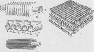 Ребристые. За счет ребристых элементов увеличивается площадь теплоотдачи, поэтому при прочих равных условиях ребристые калориферы более производительные, чем гладкотрубные. Пластинчатые модели отличаются тем, что на трубки насаживаются пластины, еще больше увеличивающие площадь поверхности теплоотдачи. В навивных наматывается стальная гофрированная лента.