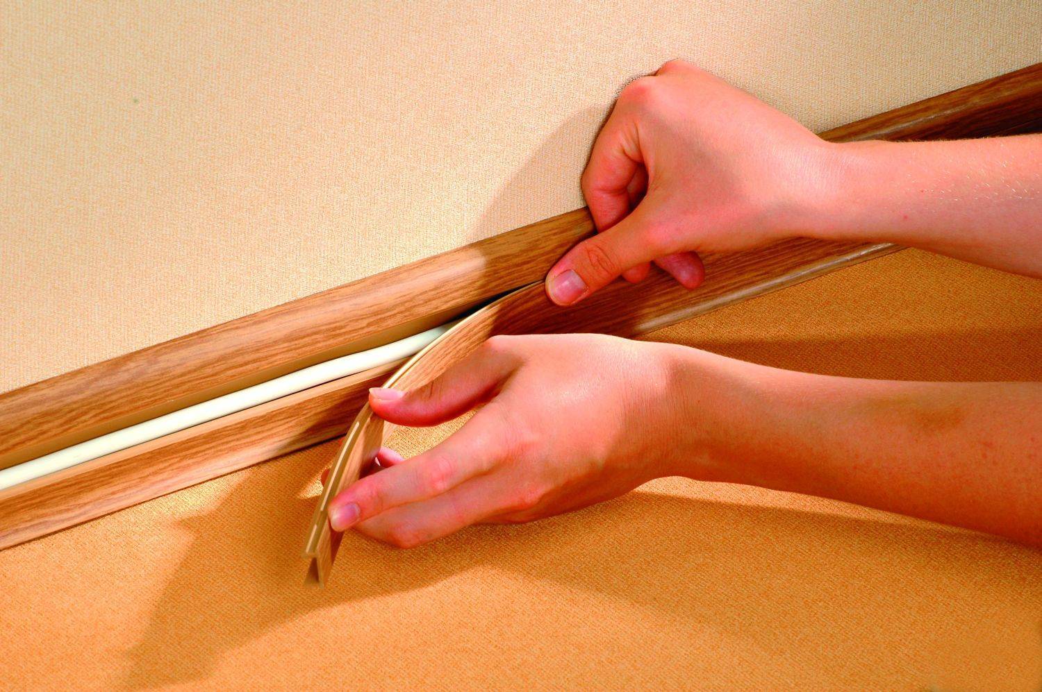 - Пластиковый плинтус, прочный и более доступный по стоимости вариант, чем деревянный аналог. Именно в пластиковых плинтусах имеется углубление – кабель-канал, в котором можно спрятать провода.