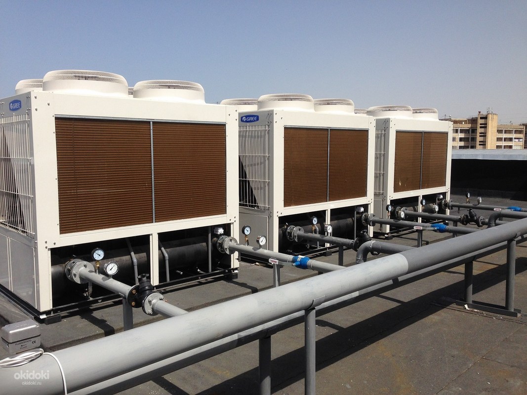 Чиллер-фанкойл по своей сути очень похож на VRF/VRV-систему, но с одним существенным отличием: в качестве фреона в чиллерах может использоваться обычная вода. Эта особенность существенно снижает цену монтажа и эксплуатации системы кондиционирования. К тому же, длина трассы может составлять несколько десятков или даже сотен метров.