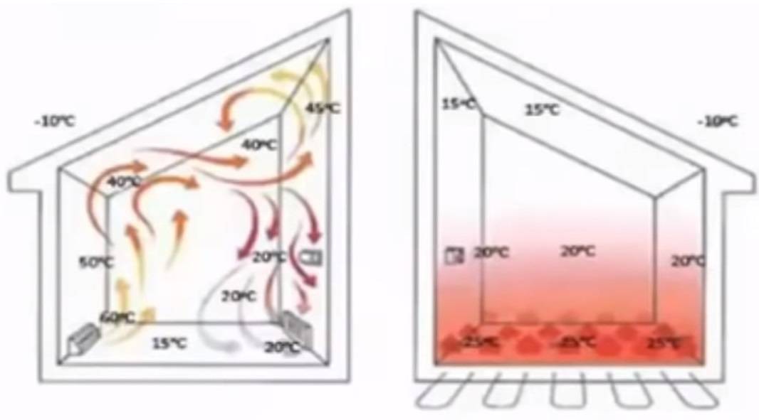 Как и все нагреватели, теплые полы имею свои преимущества и недостатки, на которые следует обратить внимание, чтобы понять, что лучше для комнаты. Если сравнивать с конвекцией, тепло от радиатора поднимается вверх, под потолком остывает и опускается вниз и так по кругу, следовательно, в верхней части помещения гораздо теплее чем в нижней, и чтобы повысить тепло в районе ног, необходимо повышать мощность радиатора
