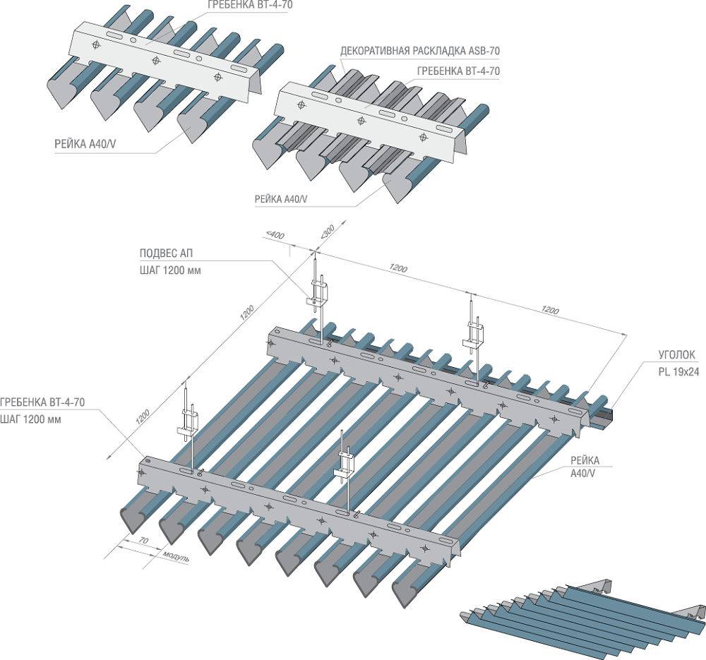 По общепринятой классификации реечный потолок относится к подвесным конструкциям модульного типа на подвесах с одной степенью свободы. Конструкция выглядит следующим образом: